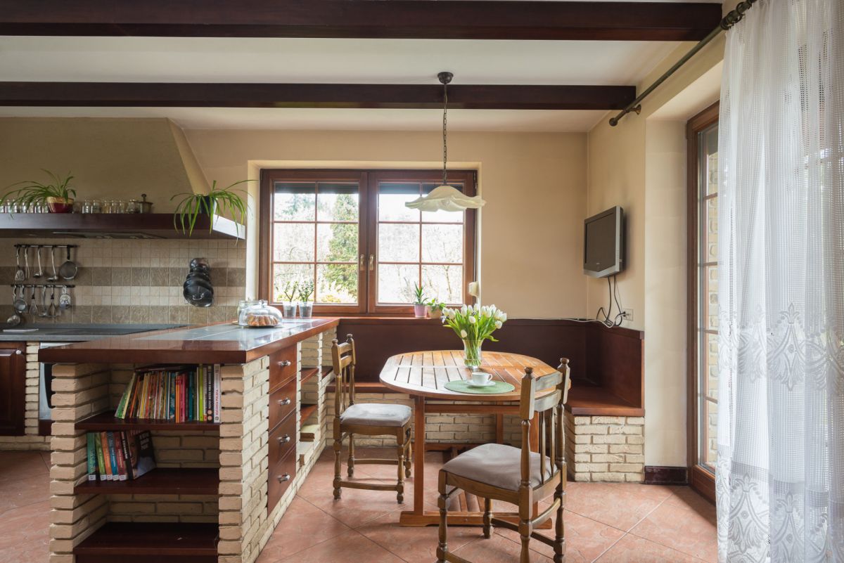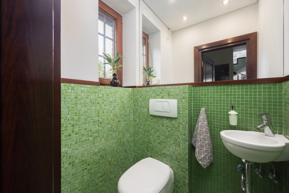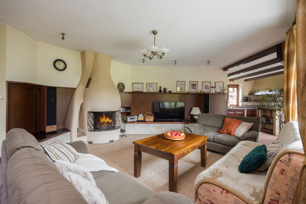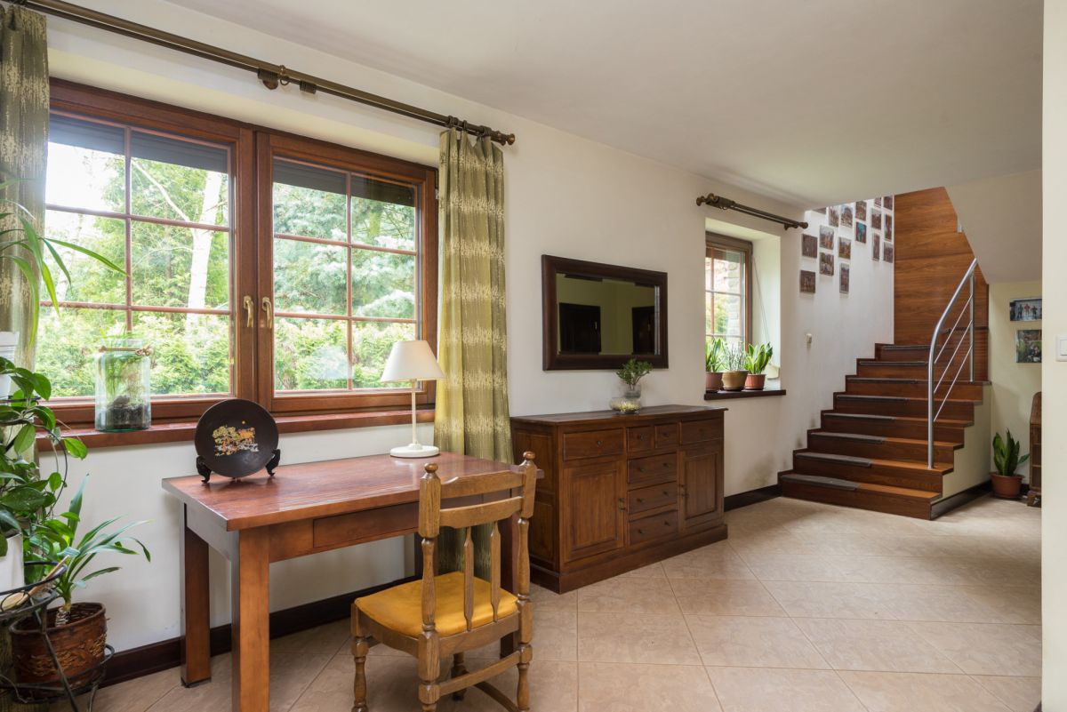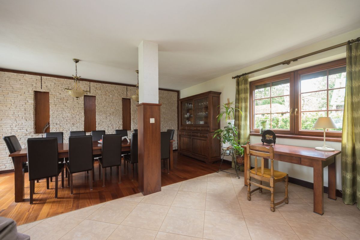 Ogrzewanie podłogowe w części salonu, kominek, ogrzewanie olejem opałowym. Stolarka okienna drewniana, podłogi z deski mahoniowej.