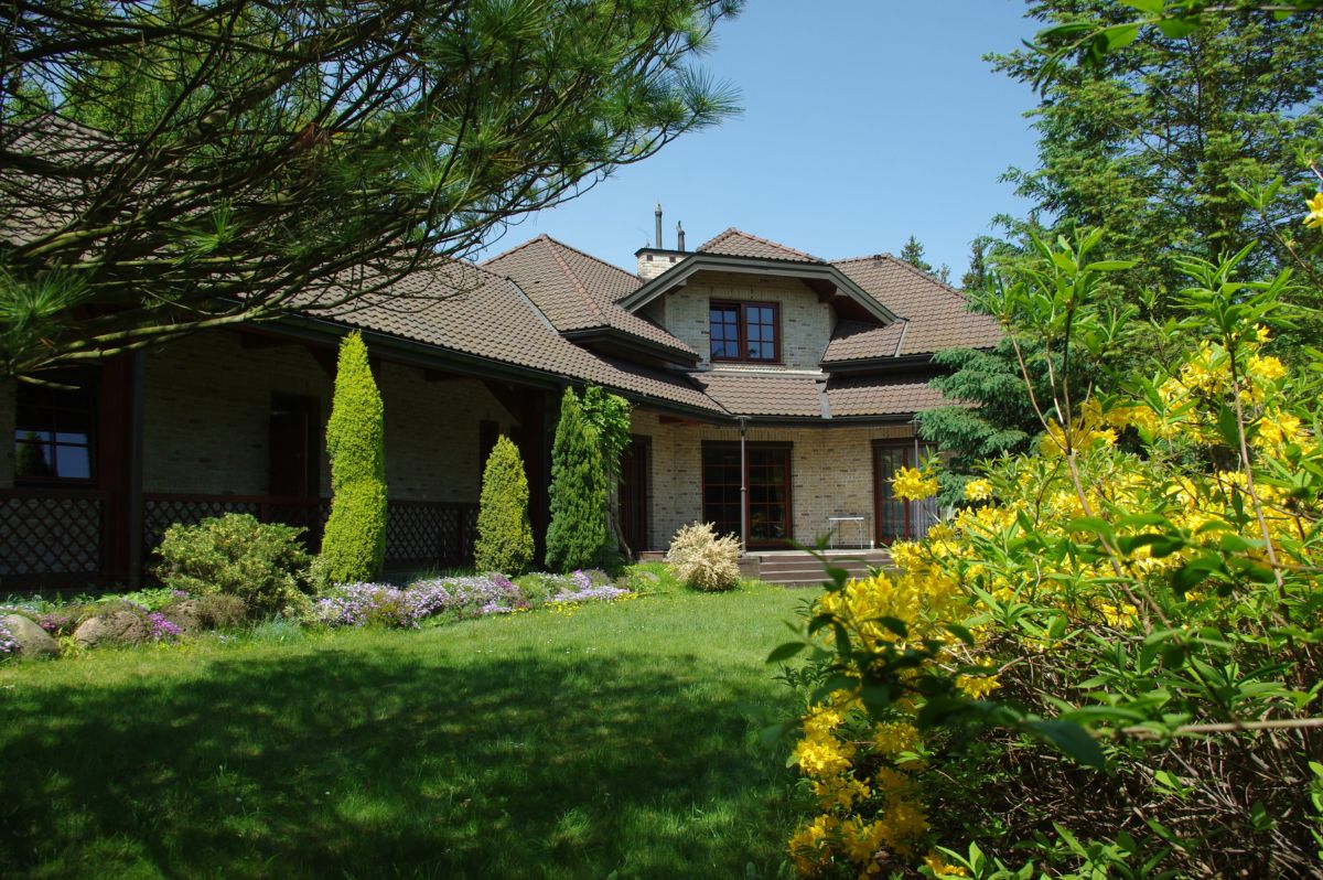 Teren wokół domu został przemyślanie zagospodarowany, podzielony jest na dwie strefy. Jedną część stanowi ogród pełniący funkcję rekreacyjną z tarasem od strony południowej, zaaranżowany krzewami i kwiatami. Nasadzenia pierisa japońskiego, tuj oraz winorośli stanowi świetną bazę do spędzania wolnego czasu na świeżym powietrzu.