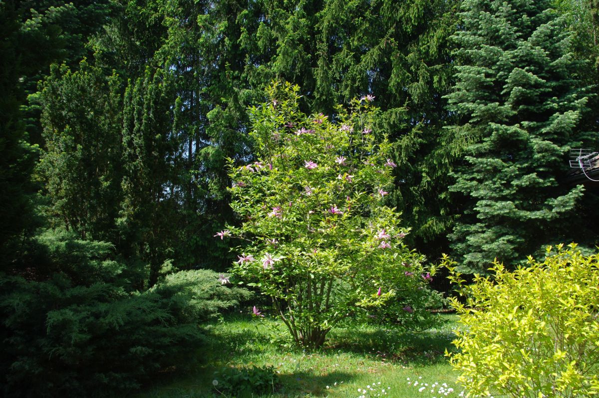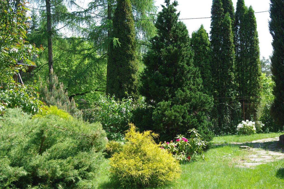 Druga część terenu to nasadzenia wysokich świerków, znajduje się tu piwniczka – spiżarnia oraz wiata samochodowa.
